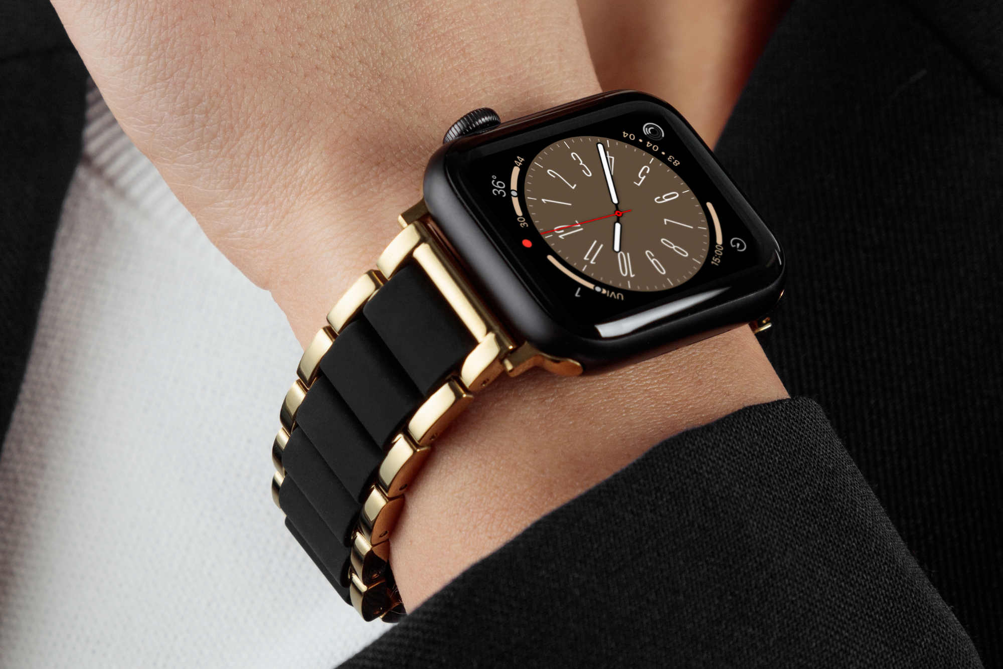 Crafted from stainless steel, this Apple Watch bracelet is built for both durability and style. The soft silicone-wrapped center links add a sleek contrast, while the ionic plating ensures a lasting finish. Adjustable to your perfect fit, it features screw-out pins, removable extenders, and extra links—plus, a screwdriver tool is included for easy customization. Sleek and refined, this bracelet is available in black and gold, blue and silver, and grey and rose-gold.