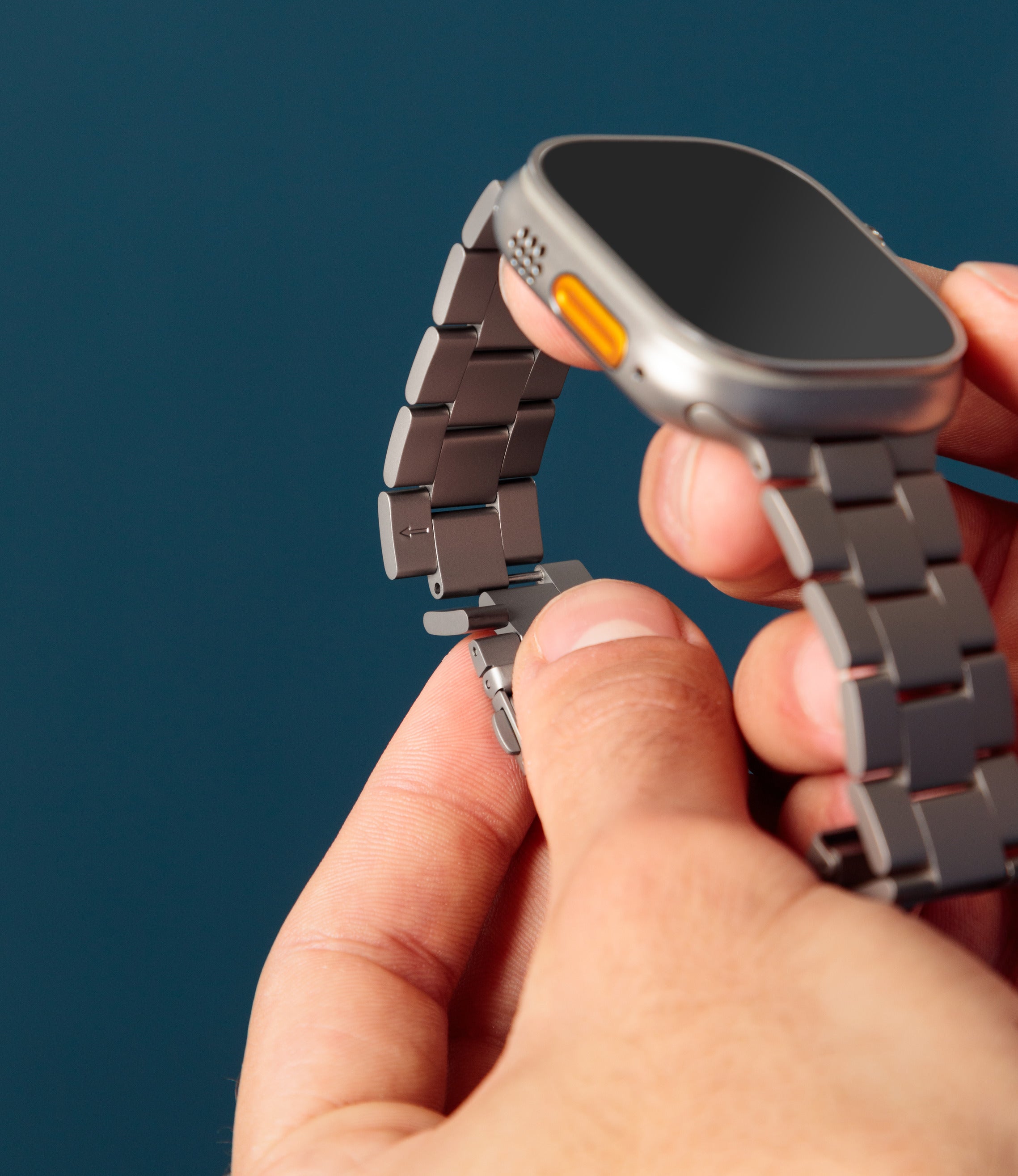 The Titanium Band -- a blend of sophistication and adeptness for your Apple Watch. Engineered with easily removable links that require zero tools, this band allows for personalized comfort. Made from grade 2 titanium that perfectly matches the Ultra and Ultra 2 Apple Watches, it boasts unrivaled durability, 30% stronger and 45% lighter than stainless steel. Enjoy its hypoallergenic properties and safeguard your watch strap with the Diamond-like Carbon (DLC) protective coating. This crucial layer enhances durability and daily wear resistance and acts as a formidable shield against scratches, ensuring your watch band remains pristine and resilient over time.